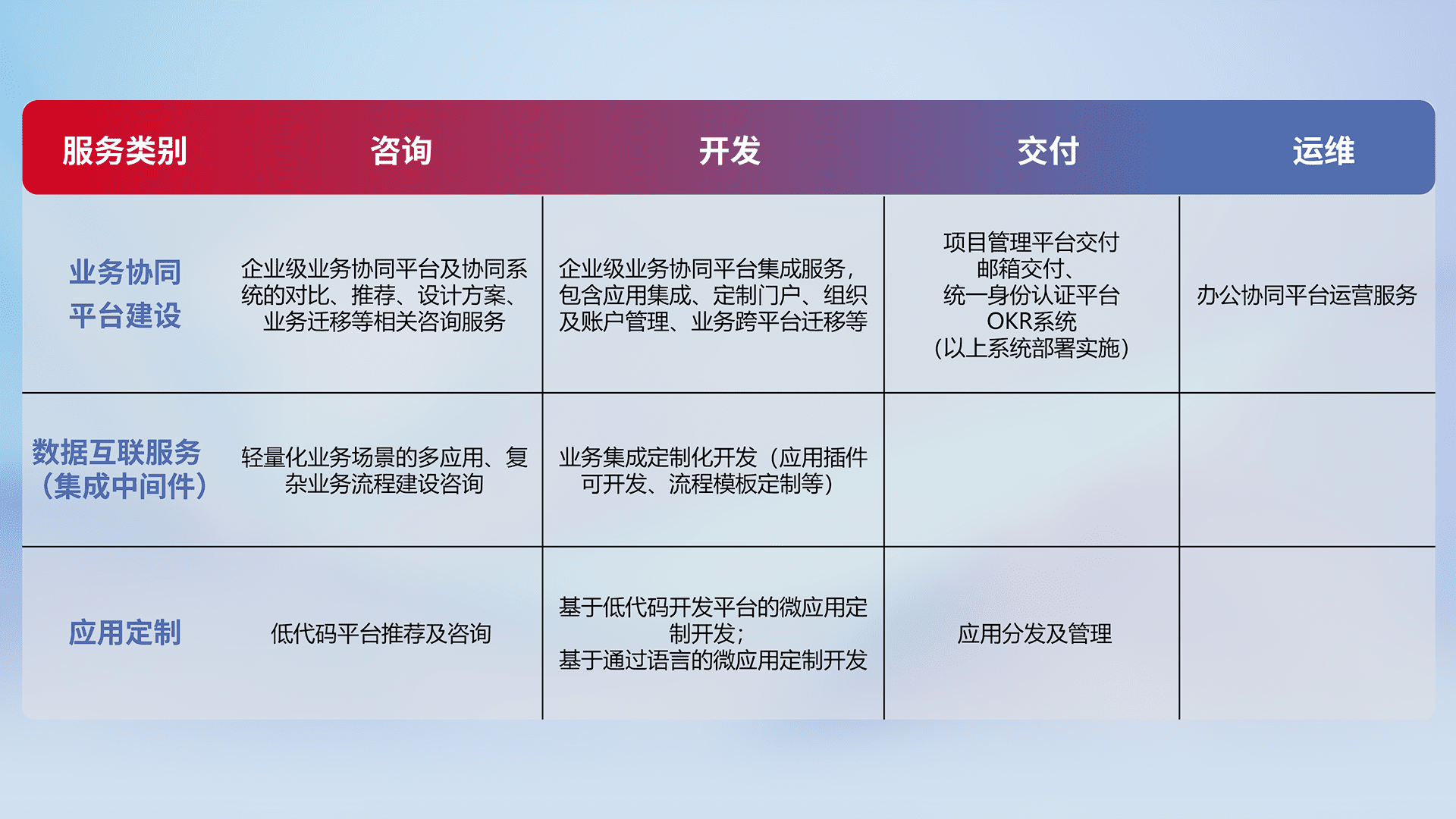 针对钉钉、、、企微、、、、IDaas等平台级产品提供产品的规划、、、方案、、、交付、、定制化开发等服务,,,,实现如统一协同办公、、、、智能客户服务、、、、混合会议管理、、、、智能数据查询、、、等业务场景,,,实现数字化转型。。。